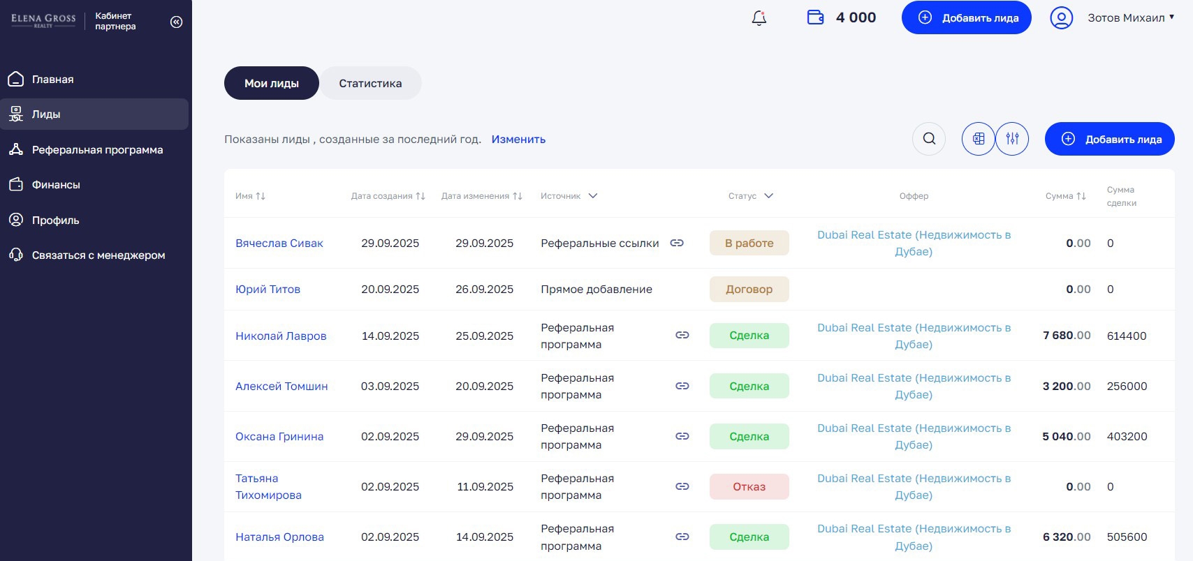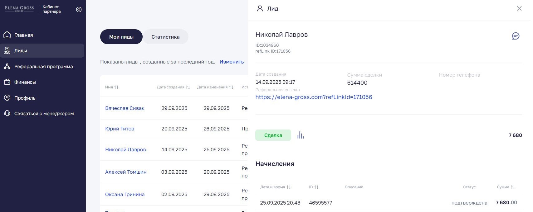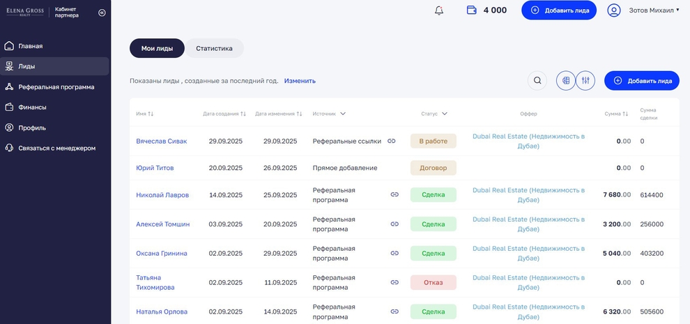 В этом разделе отображаются все клиенты, которые пришли по вашей реферальной ссылке или были добавлены вручную через кнопку «Добавить лида».